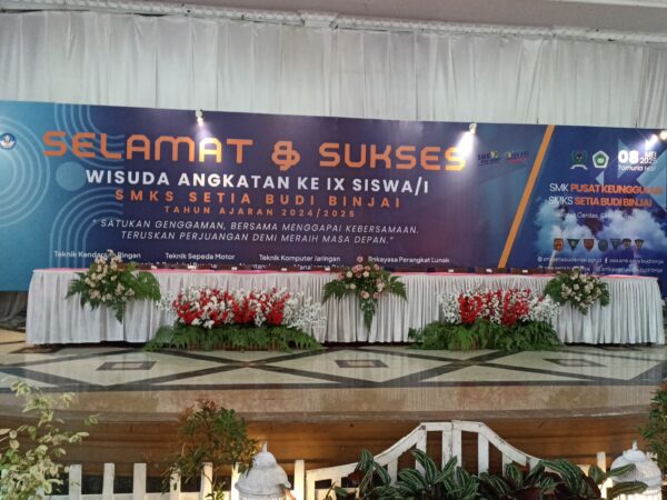 Binjai. 08 Mei 2025. SMK Pusat Keunggulan. SMK Setia Budi Binjai mengadakan Acara wisuda tahun 2025, kegiatan Wisuda ini merupakan acara wisuda yang ke-sembilan untuk SMK Setia Budi BInjai... acara ini diaksanakan tepat pada hari Kamis, tanggal 08 Mei 2025, bertempat di Tumoria Hall Kota binjai. Acara ini dihadiri oleh Bapak pengurus Yayasan pendidikan setia budi binjai (Bapak Drs. M.Syahrin...
