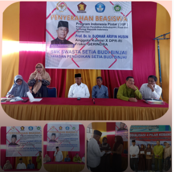 PENYERAHAN BEASISWA PROGRAM INDONESIA PINTAR OLEH BAPAK PROF. DR. IR. DJOHAR ARIFIN HUSIN UNTUK SISWA SMK Sabtu, 01 April 2023, SMKS SETIA BUDI BINJAI kedatangan tamu kehormatan Bapak Prof. Dr. Ir. Djohar Arifin Husin, anggota komisi X DPR-RI Fraksi Partai Gerindra. Beliau datang di dampingi oleh Bapak Kasi SMK Cabdis Stabat. Kedatangan beliau di sambut oleh Kepala Sekolah SMK, Ibu Tri Diani Kurn...